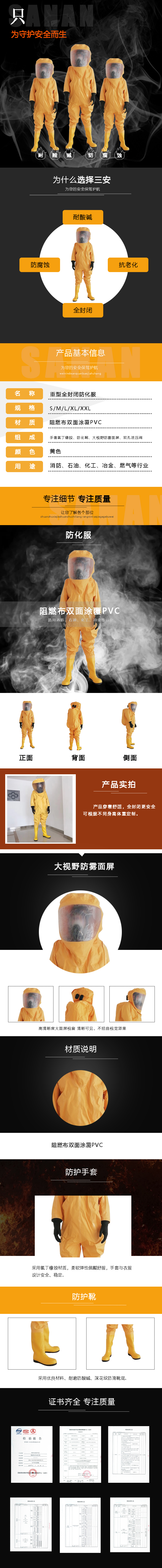 重型全封閉-PVC材質防化服本產品應用于在化學品生產或泄露引發(fā)的惡性事情時穿著的防護服裝。主要適用于消防、石油、化工、軍工、冶金等行業(yè)。