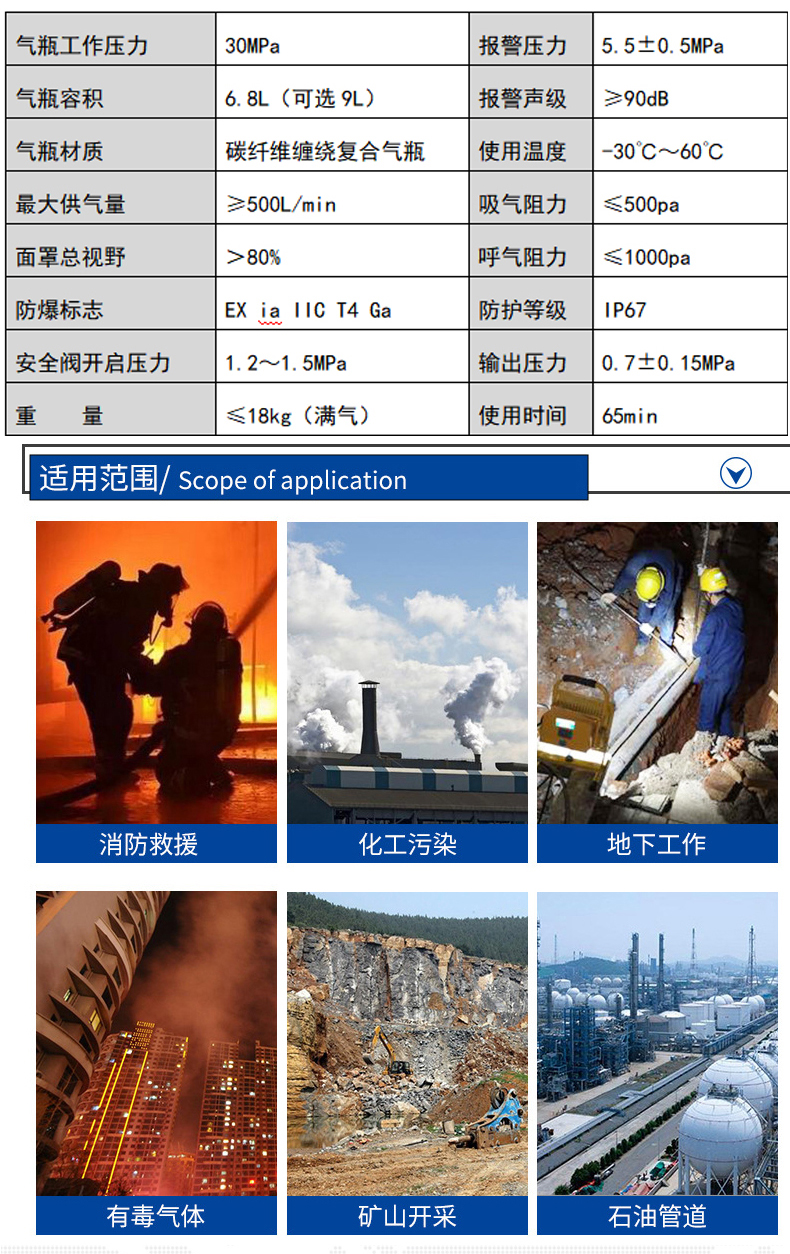 消防認證、一罐一碼,證書齊全;球形設(shè)計視野更清晰,具有防霧功能,口鼻罩采用安全無毒硅膠設(shè)計與面具貼合舒適,無異味;電集指針式與電子壓力表于一體,采用紅、黃、綠不同顏色的LED燈顯示壓力的變化范圍,結(jié)合電子壓力表使用,信號具有唯一性,同時具有跌倒報警功能;